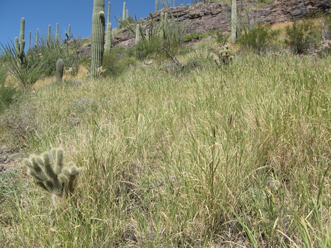 Buffelgrass is a non-native grass that outcompetes native plants in the Sonoran Desert and introduces a fire cycle that spurs rapid buffelgrass proliferation into an environment that is ecologically fire intolerant. Fires are not a natural part of the Sonoran Desert ecology, but more frequent large, hot fires such as 2020’s Bighorn Fire give us a glimpse into a fiery future. Sadly, fires fueled by buffelgrass kill our magnificent saguaro cacti and threaten the survival of many native plants and animals such as the desert tortoise.