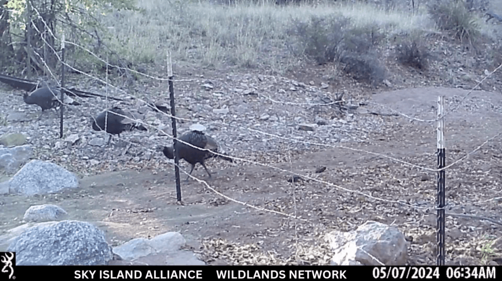 Vehicle barriers, shown in the bottom three images, allow for greater wildlife connectivity and more successful crossings for bear, deer, and turkey. These screenshots are from Sky Island Alliance wildlife camera recordings. Watch the videos here.